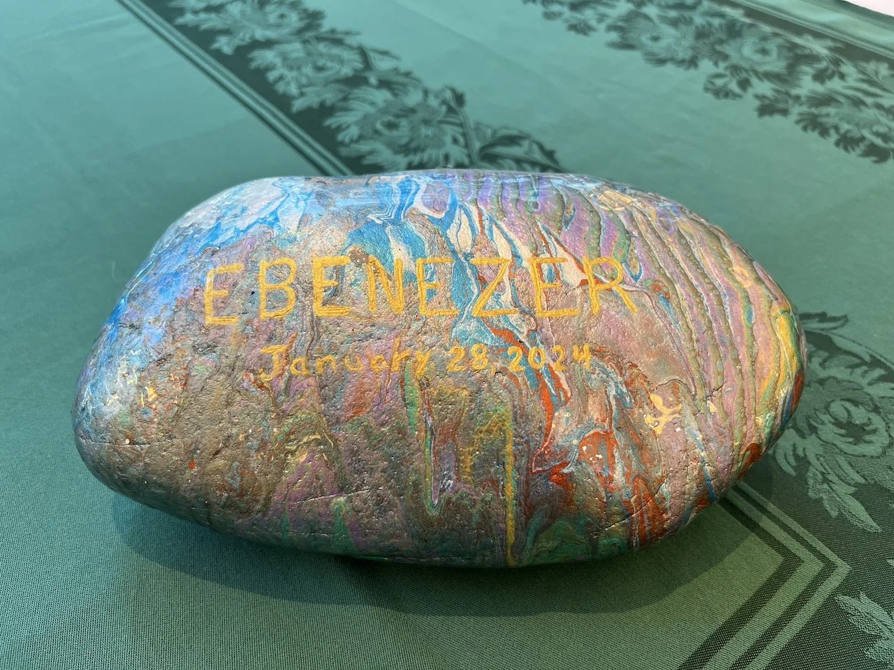 Our meeting opened with a meditation on God's faithfulness in times of change offered by our Clerk, Frank Shirbroun and our "Ebenezer Stone" remained in the center of the table--a reminder that "Thus far the Lord has helped us.” [1 Samuel 7:12]